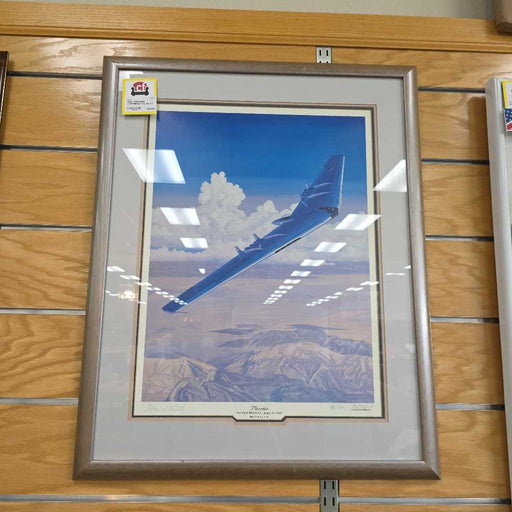Rock's Consign Furniture RenoNorthrop YB-49 Flying Wing artwork by Max Stanley, signed by Hal McCormick — a striking aviation-themed piece celebrating the iconic experimental a...