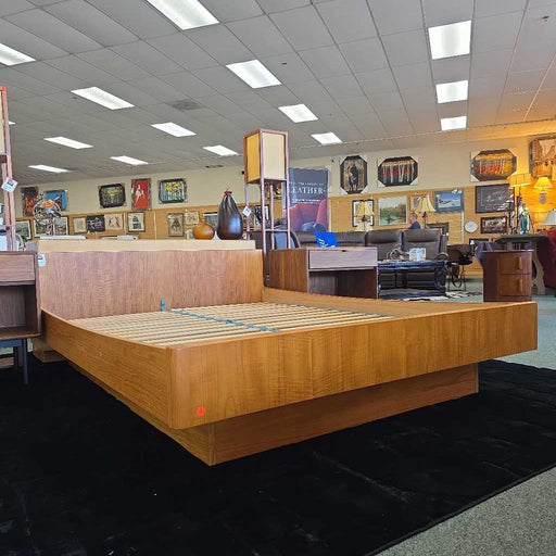 Rock's Consign Furniture RenoQueen Mid-Century Danish Modern Teak Platform Bed featuring a low-profile headboard and sleek, minimalist design.