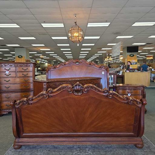 Rock's Consign Furniture RenoCalifornia King Sleigh Bed, featuring intricate carved details and a graceful, classic design.