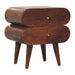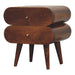- Bubble Chestnut Nightstand - This quirky nightstand boasts a round capsule-style design on both drawers. It is crafted from 100% solid mango wood in a warm chestnut finish, and it is both durable and stylish. Supported by Nordic-style legs, this table features a modern aesthetic and a shiny brass knob on each drawer.
