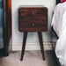 - Mini Light Walnut Curved Nightsand - The mini version of our famous IN308, this small but handy nightsand makes a perfect stand for nibbles, drinks, or a lamp. It will prove handy all over your home and is made from 100% solid mango wood in a fine light walnut finish. It has curved edges which will fit into any home/living space. It also comes with 2 drawers that come with shiny knobs and 4 Nordic style legs. This petite product is a part of Recession Collection.