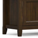 - Transitional design includes rounded molded table top, ladder framed doors, square, slightly tapered legs and antique bronze classic drawer pulls