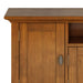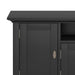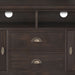 • Features a large centrally located open area with two open spaces, two (2) drawers as well as two (2) framed doors with enclosed spaces; the two (2) large side storage cabinets open to one (1) adjustable shelf each.