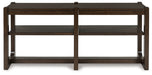 If casual contemporary style is your thing, then you'll love this sofa table. A wood-tone finish with a rich, dark grain contrast lends a soothing sensibility, while two independent adjustable shelves add function to great form. Sleek and stylish, this versatile piece is also ideal as a TV stand or console bookcase. What a fresh take on cool for the modern home.