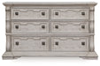 Details Made with hardwood solids, oak and ash swirl veneers, MDF substrates and cast resin components, Antiqued white finish, Hardware with antiqued bronze-tone finish, 6 smooth-gliding drawers with fully finished interiors, English dovetail construction and heavy-duty ball-bearing side glides (top drawers felt lined)