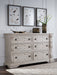 Inspired by the grandeur and grace of European traditional style, this opulent dresser is nothing short of stunning. Its large-scale decorative scrolled pilasters, along with an ash swirl border and walnut inlay crowning the top, are sure to make a sophisticated statement in your restful retreat. A timeless antiqued white coloration and bronze-tone drawer pulls lend an air of subtle elegance to this sumptuous piece.