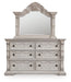 | Details | Includes dresser and mirror, Dresser made with hardwood solids, oak and ash swirl veneers, MDF substrates and cast resin components, Mirror made with solid wood, Antiqued white finish, Hardware with antiqued bronze-tone finish, 6 smooth-gliding drawers with fully finished interiors, English dovetail construction and heavy-duty ball-bearing side glides (top drawers felt lined), Mirror attaches to back of dresser | |