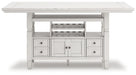 | Details | D642D7: Includes dining table top and base, Made with rubberwood solids, ash veneer and MDF substrates, Antiqued white finish with wood grain texture, Two 10-bottle wine storage shelves (1 reversible), Lower door cabinet accessible from both sides, 2 pass-through drawer bins, Assembly required, D642-124: Made with wood, Antiqued white finish with wood grain texture, Foam cushion with polyester upholstery, Nailhead trim, X-back, Assembly required, | |
