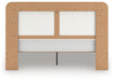 Looking to make a subtly striking statement in your bedroom? We've got you covered. This king upholstered bed’s sophisticated two-tone treatment marries a warm brown finish over replicated walnut grain with a white finish. Highlighted with a wonderful white faux leather, the headboard features warm ambient lighting for that cozy feeling we all love at bedtime. Rounded corners radiate an air of modern panache. It’s a master class in contemporary yet comfortable character.