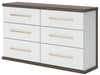 Looking to make a subtly striking statement in your bedroom? We've got you covered. This dresser's sophisticated two-tone treatment marries a warm brown finish over replicated walnut grain with a matte white finish. Rounded corners and a thick top radiate an air of modern panache, while sleek handles in a champagne finish add a sparkling touch to the spacious drawers. It’s a master class in contemporary yet comfortable character.