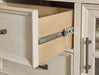 Details B683B6: Includes panel headboard, footboard, rails and slats, Made with hardwood solids, veneers and MDF substrates, Two-tone finish (antiqued white and light gray wood tone), Foundation/box spring required, sold separately, Mattress available, sold separately, Assembly required, B683B1: Includes dresser and mirror, Made with hardwood solids, veneers and MDF substrates, Two-tone finish (antiqued white and light gray wood tone), Dark bronze-tone bar pulls, 2 glass-front cabinets, each with single storage shelf, 5 drawers with fully finished interior, dovetail construction and heavy duty ball-bearing side glides (top drawer felt lined), Mirror attaches to back of dresser, B683-92: Made with hardwood solids, veneers and MDF substrates, Two-tone finish (antiqued white and light gray wood tone), Dark bronze-tone bar pulls, 2 drawers with fully finished interior, dovetail construction and heavy duty ball-bearing side glides (top drawer felt lined), 110V power supply with USB-A and USB-C charging ports, Power cord included; UL Listed,