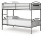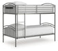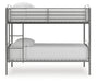 Details Made with welded tubular steel frame, Durable steel gray powder coat finish, Tubular steel slats for mattress support, Top bunk with protective side rails, Sturdy ladder leads to top bunk, Ladder with left or right side convertibility, Bunk can convert into two twin beds, Bed does not require additional foundation/box spring, Mattress available, sold separately, The Consumer Product Safety Commission states top bunks not be used for children under 6 years of age, Assembly required