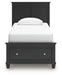 | Details | Includes panel headboard, storage footboard with roll slats and rails , Made with hardwood solids, birch veneer and MDF substrate, Side rails feature laminated solid hardwood slat support rails (or LVL) with glued and screwed blocking for added strength, Black painted finish, Round metal drawer knob with satin nickel-tone finish, Smooth-gliding drawer with ball-bearing side glides in footboard, Tapered feet, Bed does not require additional foundation/box spring; accommodates most zero clearance adjustable bases with the addition of a bunkie board, Mattress available, sold separately, Assembly required | |