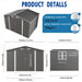 Large Metal Garden Shed With Double Door And Windows Waterproof Tool Shed - Gray