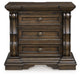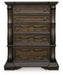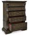 Details B947B2: Includes upholstered panel headboard, upholstered panel footboard and panel rails, Made with hardwood solids, oak and ash swirl veneers, MDF substrates and cast resin components, Dark brown finish, Polyester upholstery with button tufting, Foundation/box spring required, sold separately, Mattress available, sold separately, Assembly required, B947B1: Includes dresser and mirror, Made with hardwood solids, oak and ash swirl veneers, MDF substrates and cast resin components, Dark brown finish, 6 smooth-gliding drawers with dovetail construction (top drawer felt lined), Drawer pulls with antiqued goldtone finish, Mirror attaches to back of dresser, B947-46: Made with hardwood solids, oak and ash swirl veneers, MDF substrates and cast resin components, Dark brown finish, 5 smooth-gliding drawers with dovetail construction (top drawer felt lined), Drawer pulls with antiqued goldtone finish, B947-93: Made with hardwood solids, oak and ash swirl veneers, MDF substrates and cast resin components, Dark brown finish, 2 smooth-gliding drawers with dovetail construction (top drawer felt lined), Pull-out tray behind bottom drawer, Drawer pulls with antiqued goldtone finish, 110V power supply with dual USB charging ports, Power cord included; UL Listed,