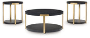 | Details | Includes coffee table and 2 end tables, Made with melamine laminate top and MDF substrates, Textural black wood grain pattern, Metal legs with durable goldtone powder coat finish, Lower display shelf, Coffee table with casters for easy mobility | |