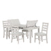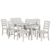 The Echo Dining Set includes a 66" table and side chairs, blending rustic charm with modern function. Crafted from solid Rubberwood, engineered woods, and Oak veneers, it offers durability and style. A multi-step driftwood finish enhances the wood grain with pale gray and white wash tones. The table features a sleek silhouette, a central storage drawer, and lift-top compartments. Classic ladderback chairs with padded upholstered seats ensure comfort and support, making this set ideal for gatherings.