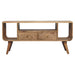 - Features: 100% solid mango wood,natural oak-ish finish,unique ridged design,4 Nordic style legs,2 spacious drawers,Brass knobs