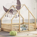 Full Wood House-Shaped Floor Bed With Fence, Guardrails - Natural