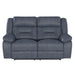 With its plush headrest, pillow-top arms, and precisely placed lines of tufting on the backrests, the Declan collection is ready to set sail. This transitional reclining sofa, loveseat, and chair effortlessly fit into both contemporary and casual living rooms. Featuring a smooth metal motion lever for easy reclining, the durable genuine leather upholstery provides lasting comfort where it matters most, complemented by matching faux leather on the sides and back. The swivel glider recliner chair is a true captain’s chair, with a smooth glide and swivel mechanism perfect for navigating your downtime. In a calming dark blue-gray hue, the Declan collection makes every living space feel like your personal harbor.