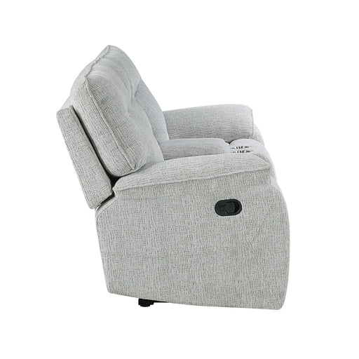 New ClassicEnhance your living space with the perfect blend of comfort and functionality with the Chablis Reclining Console Loveseat in Mist Gray. Crafted wit...