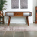 • Artisan Furniture Solid Wood Curved Coffee Table - This Coffee Table offers clean, curved edges and has been constructed from 100% Solid Mango Wood in a rich, finish. Some features include 2 drawers that have a shiny knob, 2 open slots to place any books, photo frames or ornaments and stands on 4 Nordic style legs.