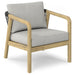 - Chair frame, seat base, arms and legs are constructed from solid acacia wood and handfinished in light teak
