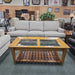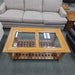 Wood & Glass Coffee Table – Features leather strap accents and a glass top, perfect for a stylish living room centerpiece.