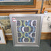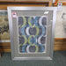 Modern geometric wall art featuring overlapping circular patterns in shades of blue, green, gray, and white. Set in a sleek silver frame, this piece adds a bold and contemporary touch to any space.