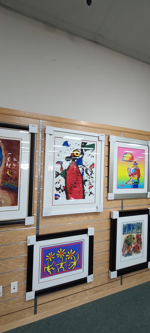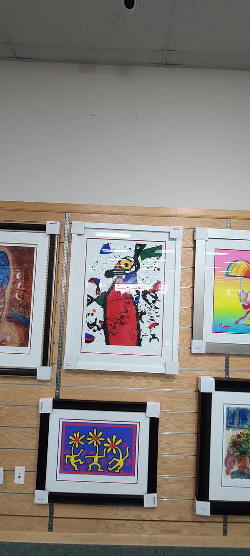 Rock's Consign Furniture RenoVibrant Joan Miró artwork Topo Rosso con Manti, featuring bold abstract forms and rich color — a striking modern statement piece.