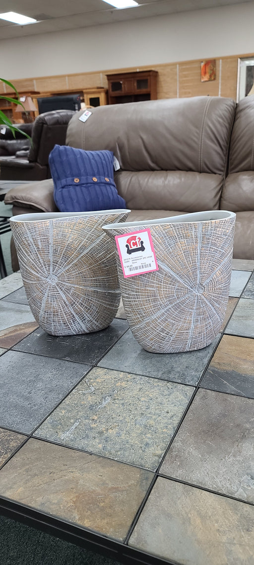 Rock's Consign Furniture RenoGoldtone Vase set – A striking blend of primitive and modern design, this wide-mouth polyresin vase showcases an antiqued goldtone finish and an ey...