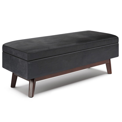 Simpli-HomeHand constructed using solid wood, engineered woods and high density foam Upholstered with a durable Distressed Black Vegan Faux Leather Features ...