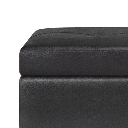 Simpli-HomeHand constructed using solid wood, engineered wood and high density foam Upholstered with a durable Distressed Black Vegan Faux Leather Features l...