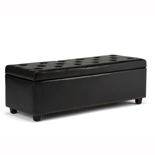 Simpli-HomeHand constructed using solid wood and high-density foam. Upholstered with stitching detail. Features a lift-up lid with child safety hinges and on...