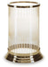 | Details | Made with metal and light amber carved glass, Brass-tone finish, Holds 1 pillar candle up to 3" (not included) | |