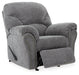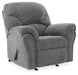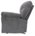 Why sacrifice comfort for style (or style for comfort) when you can have the best of both in this rocker recliner in pewter gray. Elements include a chic divided-back design and pillow top wrapped armrests that make nodding off all too easy. Calling attention to the elegantly flared armrests—black nickel nailhead trim for a punch of cool character.