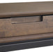 - Features: two notched handle side drawers with ball bearing drawer glides and one center flip down drawer/keyboard tray