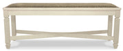 The beauty of this upholstered dining bench is something to savor. Serving up comfort and flair, this generously scaled bench entices with a cushioned seat covered in a heavy woven fabric that complements the antiqued white finish.
