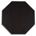 | Details | Made with mango wood veneer and MDF substrates, Dark espresso brown finish, Octagonal top, Trapezoid-shaped legs set on round plinth base, Assembly required | |