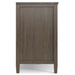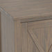 - Transitional design includes shaker style doors featuring X detail in panel, bronze pulls and square tapered legs