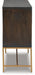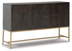 This accent cabinet is a versatile stunner with 3 geometric patterned door fronts in warm dark brown accented with goldtone finish metal hardware. Standing on a goldtone metal open frame base, the three-door console is aesthetically contemporary and sophisticated, ready to serve as buffet, console or media cabinet.
