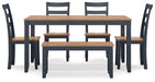 | Details | Includes dining table, bench and 4 chairs, Table made with rubberwood solids, mango wood veneer and MDF substrate, Chair made with solid wood frame, Light natural mango wood finish with a dark slate blue, Table with butcher block veneer top, Chairs and bench with mango wood veneer seats, Contoured chair seats, Chairs include adjustable levelers, Assembly required | |
