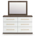 Looking to make a subtly striking statement in your bedroom? We've got you covered. A sophisticated two-tone treatment on this dresser with mirror marries a warm brown finish over replicated walnut grain with a matte white finish. The dresser's rounded corners and thick top radiate an air of modern panache, while sleek handles in a champagne finish add a sparkling touch to the spacious drawers. It’s a master class in contemporary yet comfortable character.
