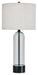 | Details | Made of glass and metal with drum hardback fabric shade, Clear glass, Metal with black finish, 3-way switch, 1 E26 socket, type A bulb recommended (not included); 150 watts max or LED equivalent; UL Listed, Minor assembly required; simply attach preassembled shade to lamp base | |