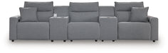 | Details | Includes 5 modular pieces: left-arm facing power recliner, armless chair, 2 consoles, and right-arm facing power recliner, "Left-arm" and "right-arm" describe the position of the arm when you face the piece, Versatile modular pieces fit together in a variety of configurations, One-touch power control with adjustable positions, Easy View™ adjustable headrest and zero-draw USB port, Zero-draw technology only consumes power when the USB receptacle is in use, Corner-blocked frame with metal reinforced seat, Attached back and seat cushions; high-quality foam cushions wrapped in poly fiber, Polyester upholstery; Next-Gen Nuvella™ is a family-friendly fabric that is soft, easy to clean, stain-resistant and durable, Clean fabric with mild soap and water, let air dry; for stubborn stains, use a solution of 4 oz. bleach to 28 oz. water, Throw pillows with easy-to-remove zippered covers for machine washing; pillows with soft polyfill, Console with plexiglass top and 2 cup holders, Zero wall recliner design requires minimal space between wall and chair back, Power cord included; UL Listed | |