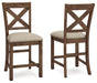This upholstered bar stool might be simple at first sight, but a closer look reveals beauty in the details. With a distressed nutmeg finish, antiqued nailhead trim and textured polyester upholstery, it's beaming with charm. Cushioned seat ensures long, lingering meals are enjoyed in comfort.