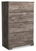 With its clean-lined look and modern attitude, this chest of drawers is a fresh style awakening. A warm gray hue over replicated oak grain easily complements other furniture finishes. Smooth drawer fronts with antiqued pewter-tone handles complete the aesthetic.