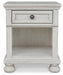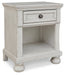 Elegant, timeless furnishings take your bedroom to the next level. Nothing does that better than this nightstand. The antiqued white finish with a wonderful grain texture radiates sophistication, while a dark bronze-tone knob adds an ornate touch. A single drawer and open bookcase cubby allow for versatile storage or display options, making this nightstand a functional favorite.
