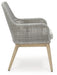 This dining arm chair invites your casual contemporary style outdoors. With its resin wicker in a chic neutral hue, it expertly marries refined design with durability. Breezy summer mornings and cold winter nights are made all the more comfortable with high-performance Nuvella+ fabric covering the seat cushion.