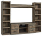 | Details | Includes 2 tall piers, bridge and TV stand, Made with engineered wood (MDF/particleboard) and decorative laminate, Warm rustic plank finish replicated oak grain and authentic touch, Each pier with 2 open shelves and cabinet with single-shelf storage, Dark bronze-tone hardware, TV stand with removable center shelf and 2 cabinets, each with single-shelf storage, Cutouts for wire management, Compatible with W100-01, W100-02 and W100-101 LED fireplace inserts (sold separately), Assembly required | |